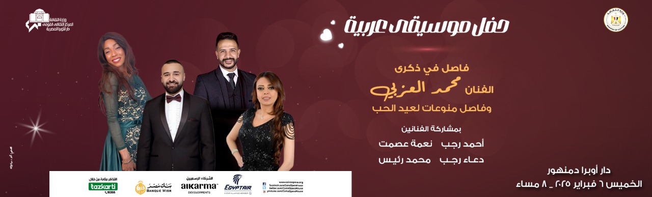 مسرح دمنهوراستمتعوا بأمسية رائعة في مسرح دمنهور يوم 2 يناير مع حفل الموسيقى العربية! عشاق الموسيقى الشرقية الأصيلة على موعد مع أجواء مفعمة بالأنغام الكلاسيكية وأداء مبهر يأخذكم في رحلة موسيقية غنية بالإبداع والتراث. لا تفوّتوا هذه الليلة الفريدة لمحبي الفنون العربية! تفاصيل أكثر هنا.