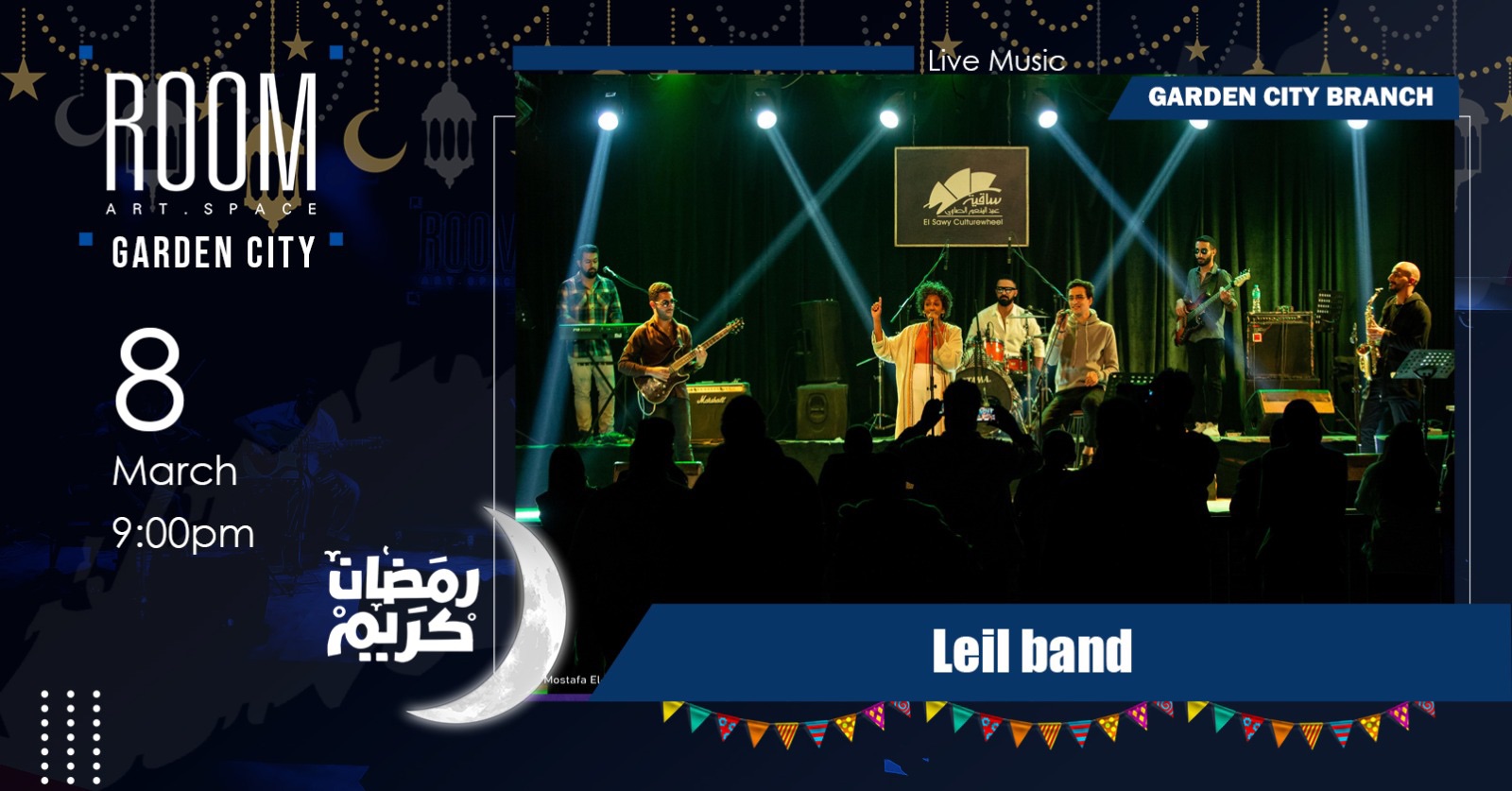 ROOM Art Space Garden City 10 Etehaad Al Mohamin st., Garden City, Cairoارقص و غني مع اصحابك في ليلة رمضانية جميلة مع فرقة ليل في رووم جاردن سيتي. تفاصيل أكثر هنا.