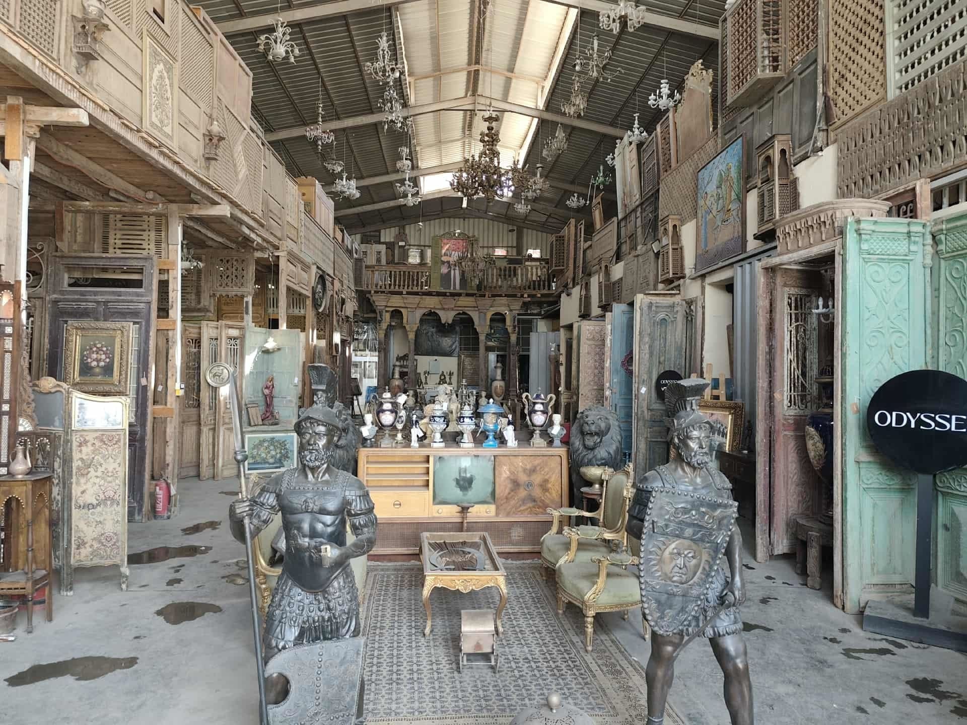 المكان عبارة عن هنجر كبير بمساحة عرض مفتوحة، فيها بارتشنات مقسمة للأنتيكات والأثاث القديم، واللي نقدر نقول إن فيها ريحة زمان وأيامه الحلوة.
