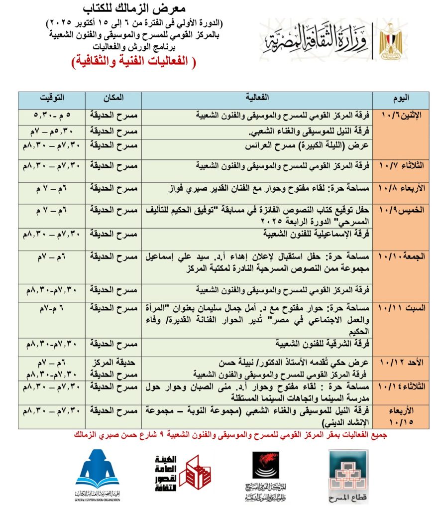 أحداث ثقافية في أكتوبر أماكن ترفيهية مجانية في القاهرة أنشطة أكتوبر الثقافية أنشطة ثقافية للأطفال الفنون الشعبية المصرية المركز القومي للمسرح والموسيقى والفنون الشعبية حفلات موسيقية في الزمالك عروض فنية وموسيقية مجانية فعاليات مجانية في الزمالك معارض وزارة الثقافة معرض الزمالك للكتاب 2025 مواعيد معارض الكتب في القاهرة ورش للأطفال في القاهرة