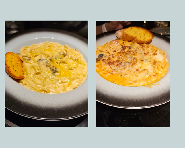 الأطباق الرئيسية قررنا نخليها باستا علشان الوقت وكمان علشان نقدر نعرف مدى خدمتهم للأطباق العادية اللي مش غالية، وأول حاجة طلبنا ألفريدو بسعر 380 جنيه وكان طعم المكرونة والصوص حلوين والحقيقة مقدرناش نحدد طعم الفراخ لأنه مكنش واضح لنا وكانت الكمية قليلة، وكالعادة البارميزان مختفية.