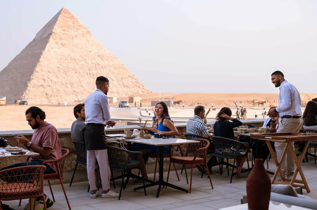 التجربة هنا مش بس أكل، لكنها لحظة استثنائية قدام الأهرامات مباشرة، وده بيخليه اختيار مثالي للي عاوز يختم يومه بشكل لا يتنسي.