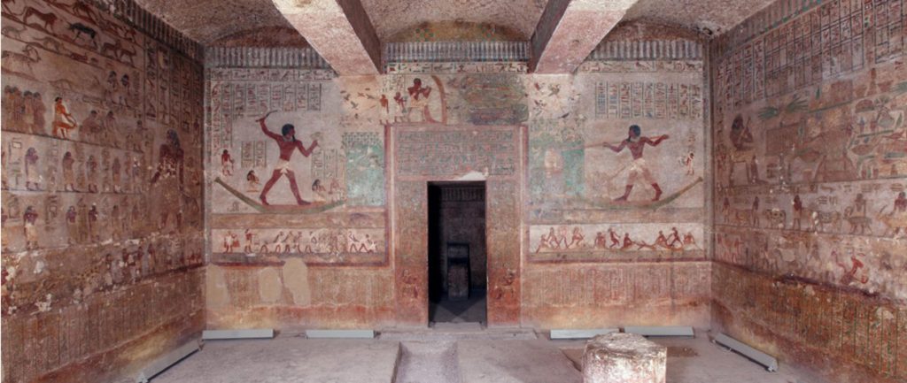 اللي بيميز مقابر بني حسن فعلًا هو الجداريات. تخيل جدارية ارتفاعها يوصل لـ5 أمتار وطولها 16 متر، مليانة تفاصيل دقيقة عن الحياة اليومية. هتشوف مشاهد صيد في الصحراء، وصيد طيور وأسماك في النيل، ورعاة بيقودوا قطعانهم، وفلاحين بيزرعوا ويحصدوا، وصناع بيشتغلوا في الخشب والفخار والمعادن.