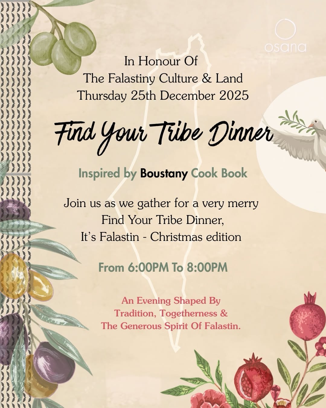 Osana Family Wellnessانضموا إلى عشاء Find Your Tribe: It’s Falastin في أمسية خاصة بروح عيد الميلاد يوم الخميس 25 ديسمبر، بتنظيم Osana Family Wellness وبالتعاون مع Olive You Hub. ليلة دافئة تجمع بين الطعام الفلسطيني الأصيل، روح المشاركة، وأجواء مجتمعية تحتفي باللقاء والاحتفاء بالثقافة. تفاصيل أكثر هنا.