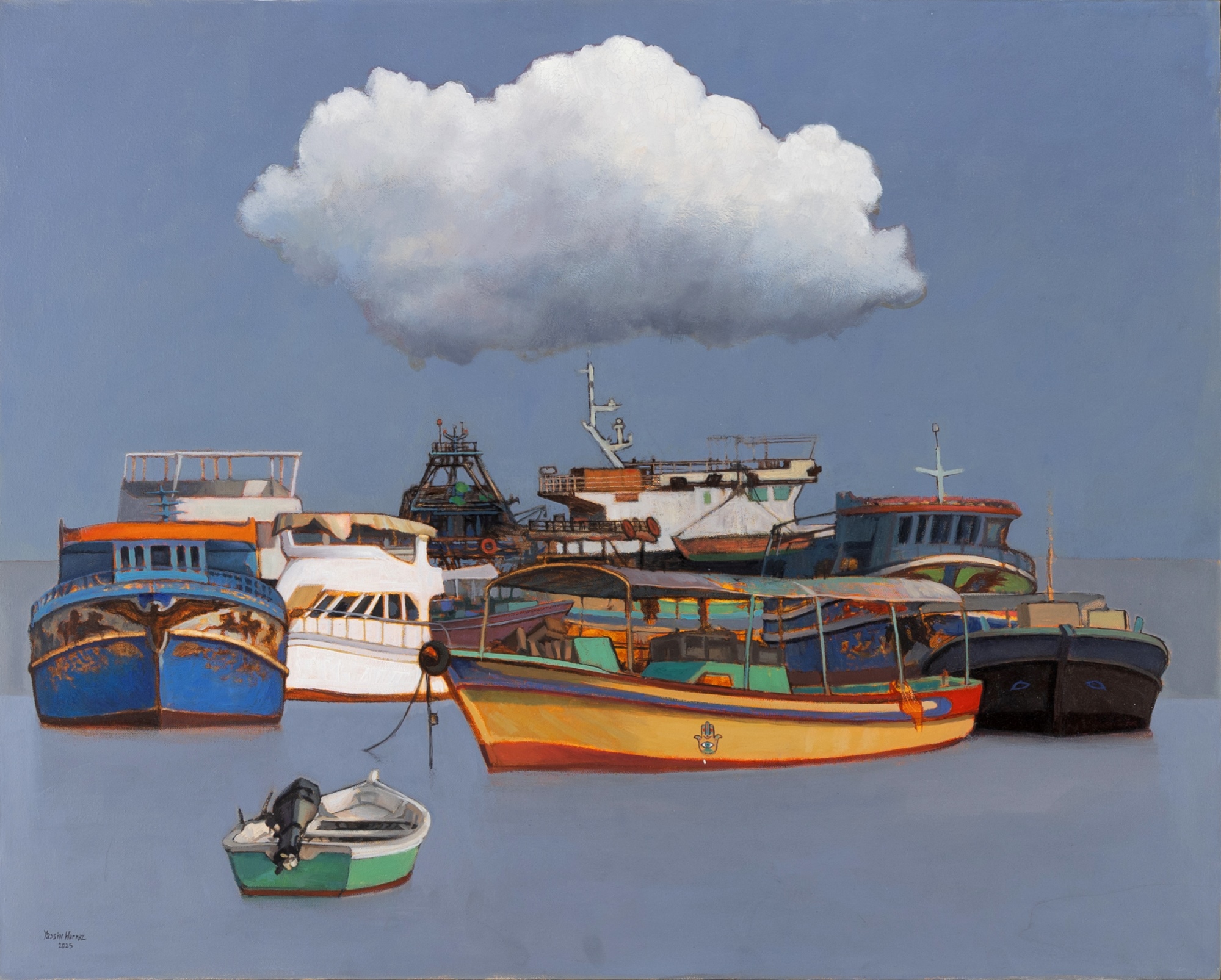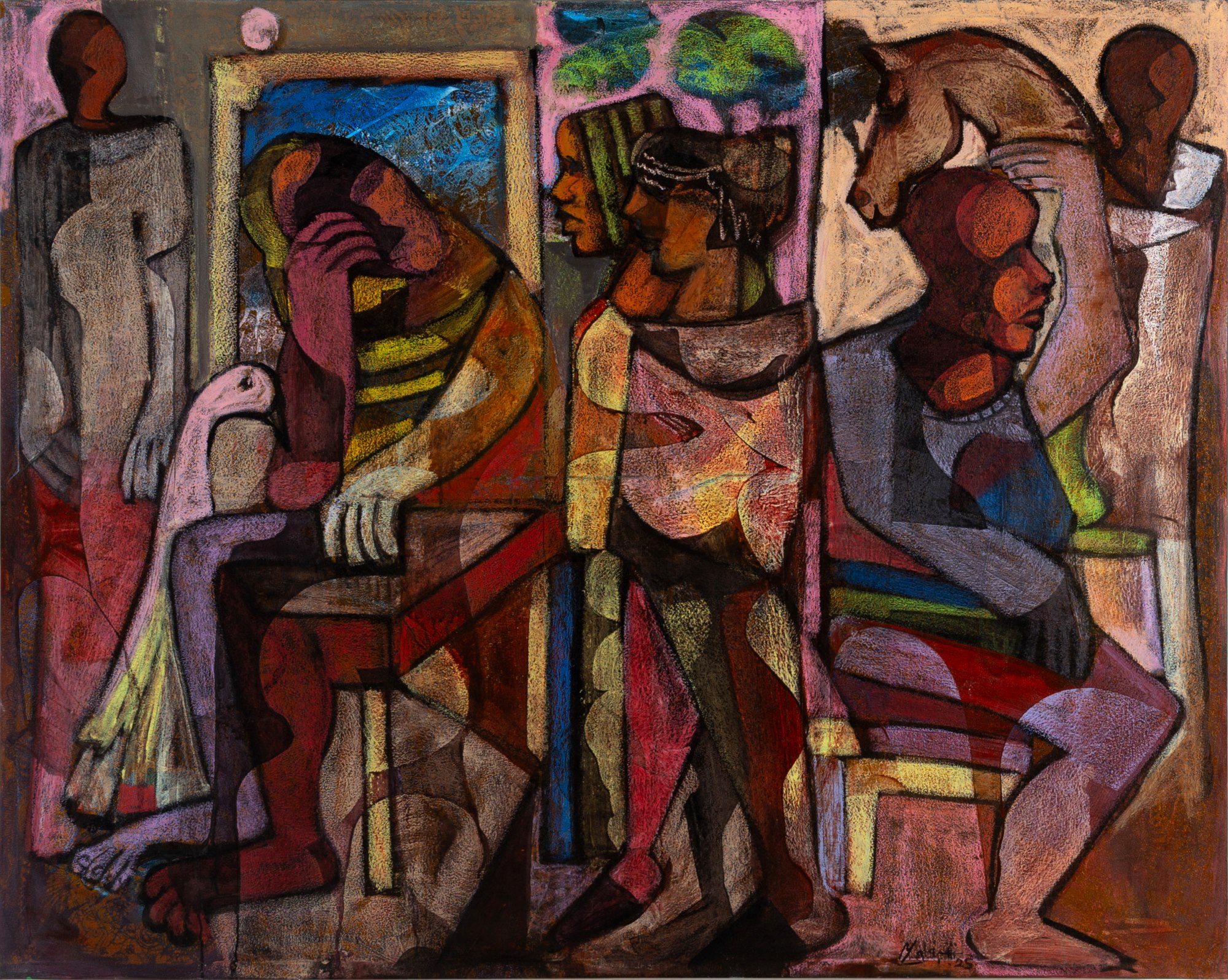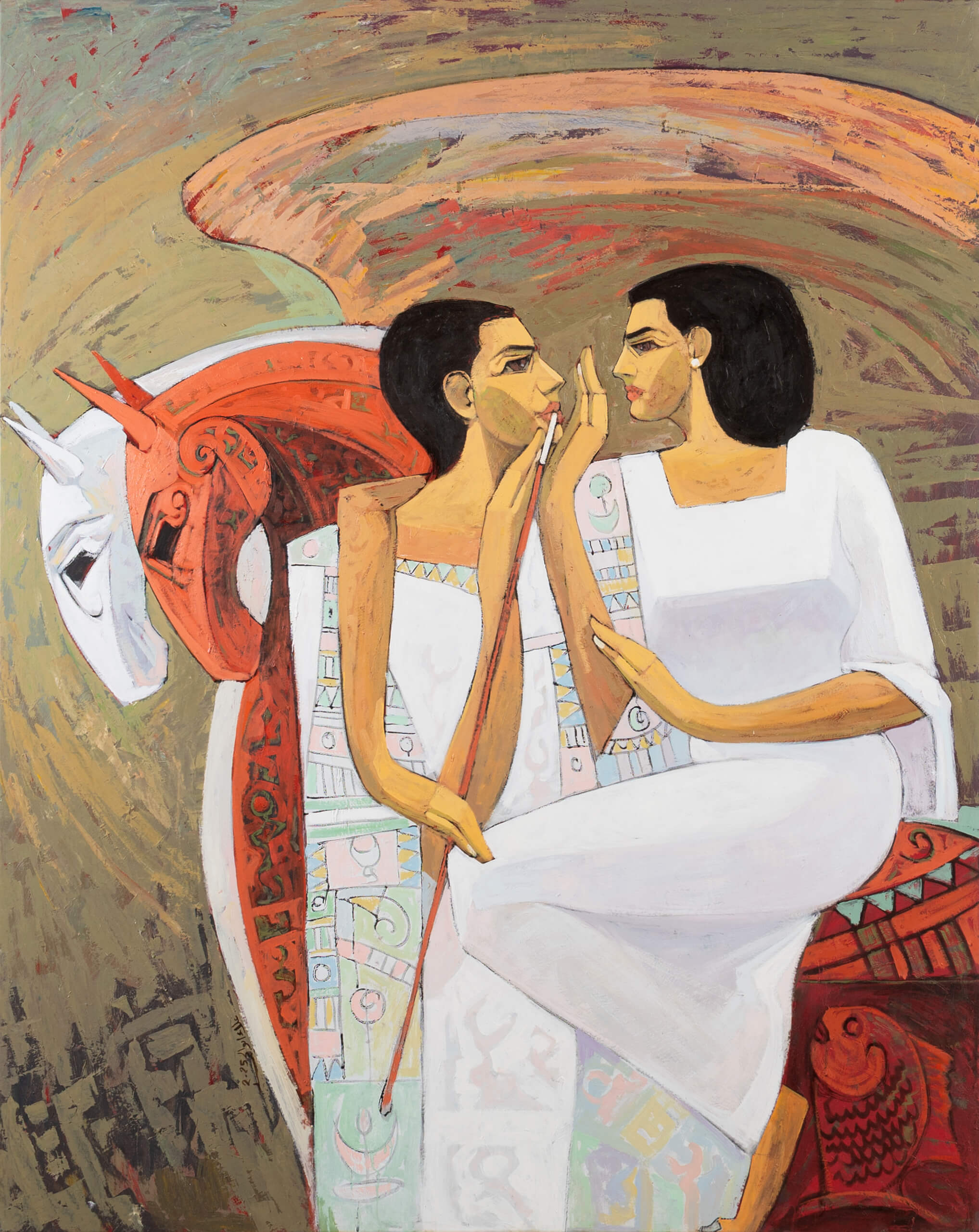 Among the celebrated names are Abdel Wahab Abdel Mohsen, whose poetic wooden reliefs echo the rhythm of the Nile Delta, and Hassan El Shark, whose folkloric scenes of village life burst with colour and spirit. Hosam Dirar’s layered compositions explore identity and womanhood through bold abstraction, while Amani Moussa’s architectural prints reimagine Cairo’s urban energy in striking monochrome.
