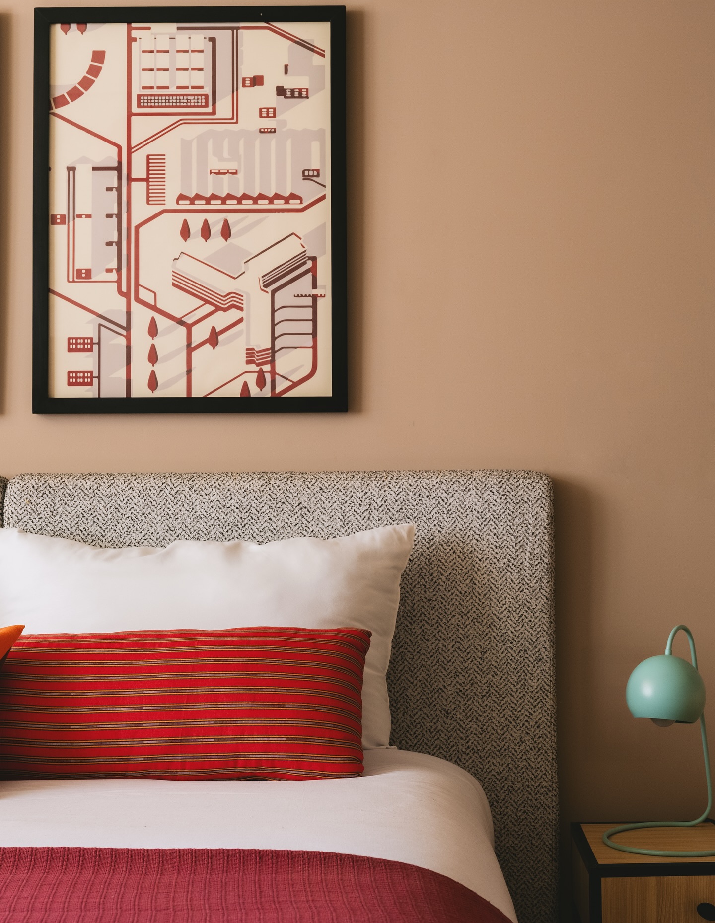 While the building belongs to Al Ismaelia, day-to-day operations are led by G’nK Group, founded by Ahmed Ganzoury and Kareem Nabil, who curated the concept and ambience of the boutique hotel. Designed by Malak Orfy, the interiors strike a balance between high ceilings and vintage patterns, complemented by bold art, muted tones, and handcrafted Egyptian furniture. The result is a space that feels both nostalgic and new, a poetic fusion of heritage and hospitality at the heart of Cairo’s rebirth.