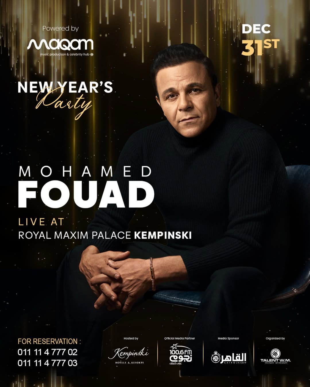 Royal Maxim Palace Kempinski delivers one of the biggest New Year’s Eve concerts in Cairo, bringing together Mohamed Fouad, Rami Ayach, Mostafa Hagag, and Carmen Suleiman on one stage. With a diverse lineup and polished production, this night is designed to cater to a range of musical tastes under one luxurious roof. For bookings, contact the hotel directly via Instagram, email at fbresv.royalmaxim@kempinski.com, or phone +20 109 711 1151.