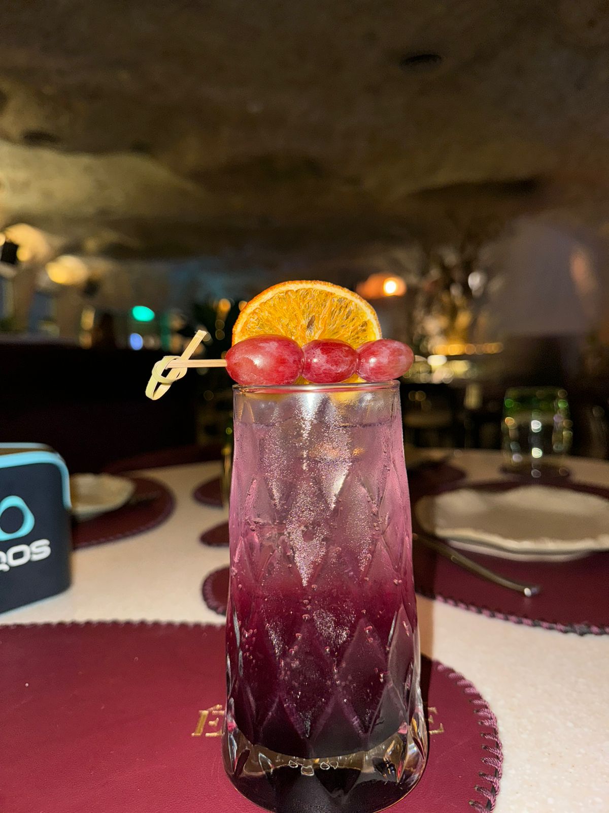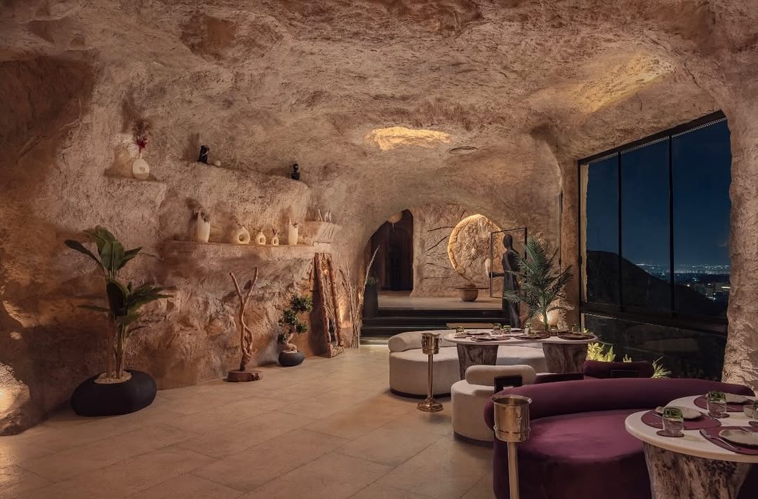 Inside, the transformation is immediate. The walls echo the rugged texture of natural rock, scattered with sculptural forms that transport you to another world. This raw, stone-carved backdrop contrasts beautifully with the deep burgundy of the tablecloths, chairs, and dining sets, which add richness and warmth to the space. Soft lighting glimmers across the surfaces, while a skylight draws the eye upward, opening the room to the sky and giving the whole setting a sense of depth and drama. It is intimate yet grand, indulgent yet grounding, an atmosphere that feels both romantic and otherworldly.
