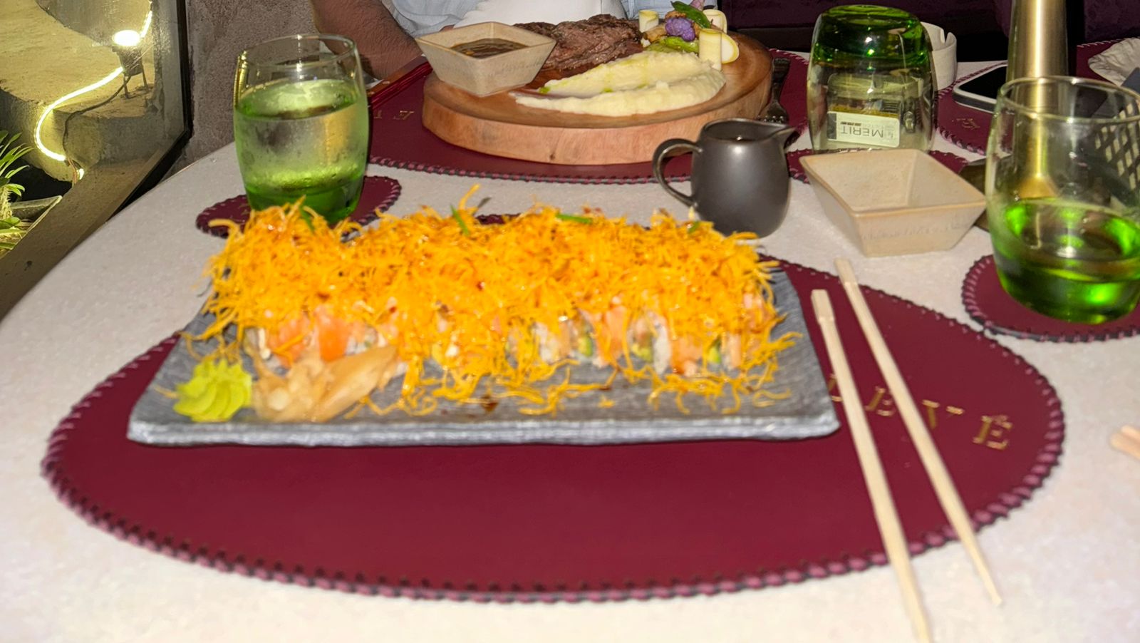 The food matches the drama of the setting. The eight-piece sushi platter (EGP 970) was presented with artistry, fresh vegetables layered beneath a crisp topping of chips. While the added crunch gave it more of a fried impression than the purely raw delicacy one might expect, the flavours were fresh, generous, and juicy, leaving a memorable finish.