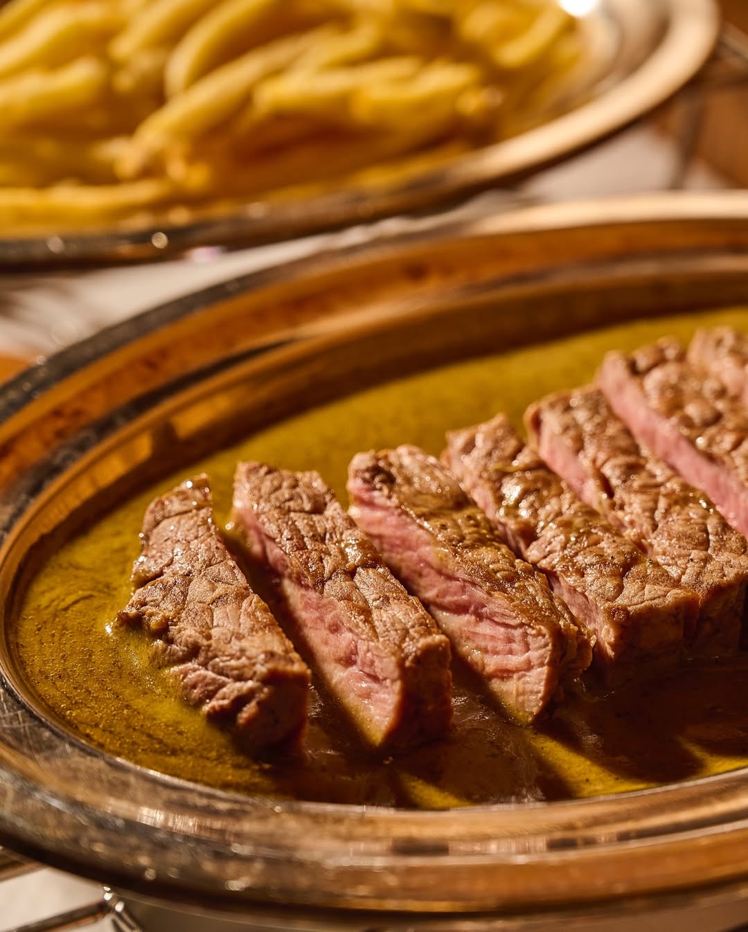 This is a classic for a reason. Les Relais de l’Entrecôte does one thing and does it well. Their formula features a perfectly trimmed counter filet served with the restaurant’s famous secret sauce, crisp pommes allumettes, and a walnut salad that cuts through the richness. There is no menu fatigue here. You sit down, eat, understand why it works, and come back again.