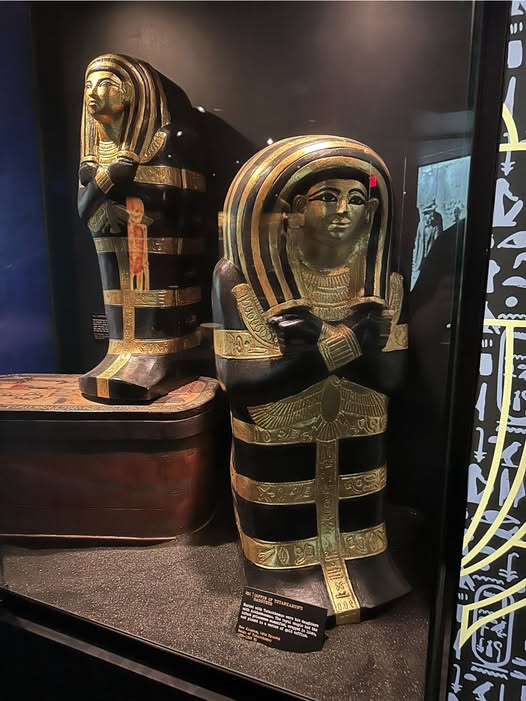 Among these items were beautifully gilded ceremonial beds shaped like sacred animals, including lions and cows, powerful emblems of strength and divine protection. Guardian statues, placed at the entrance and deep within the tomb, stood watch to protect the pharaoh as he embarked on his everlasting journey.