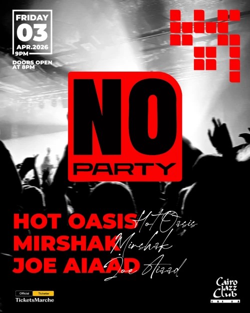 Cairo Jazz Club 197 A, 26th of July St Cairo, CairoFrom chill vibes to subtle rhythms, NO PARTY brings Mirshak, Hot Oasis, and Joe Aiaad to Cairo Jazz Club on April 3. For more information, hit this link!