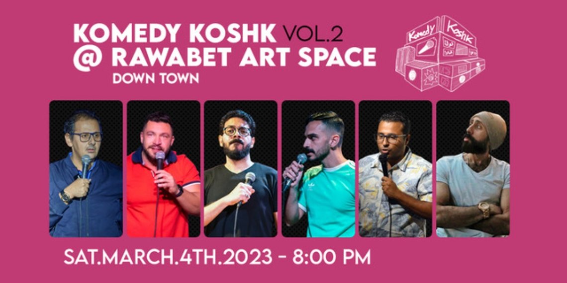Rawabet Art Space 5 Hussein Basha Al Meamari, Marouf, Qasr El Nil, CairoThe Komedy Koshk is headed to Rawabet Art Space This Saturday to prepare you for another week. Many talented comedians will take the stage, including Mina Selim, Ahmed Hassan, Mohamed Farghaly, and Paula Rizk.