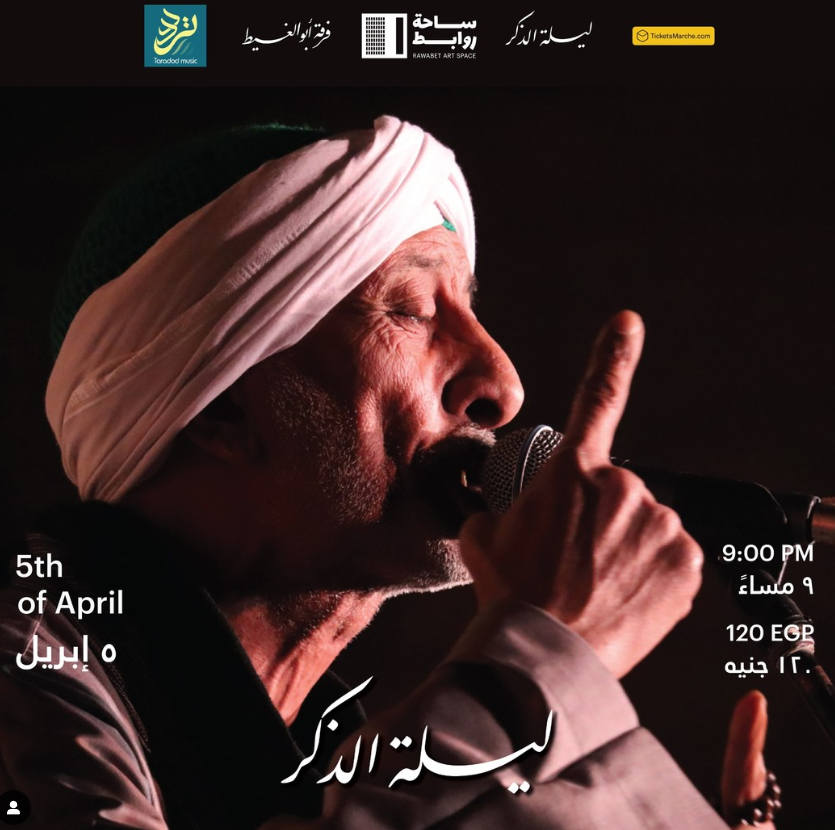 Rawabet Art Space 5 Hussein Basha Al Meamari, Marouf, Qasr El Nil, CairoA fascinating fusion of Sufi texts and Zar traditions comes to life in the Abou Al-Gheit Ensemble's performance "Laylat Al-Zikr"! Join Rawabet Art Space this Ramadan for an entrancing musical performance unlike anything you've seen
