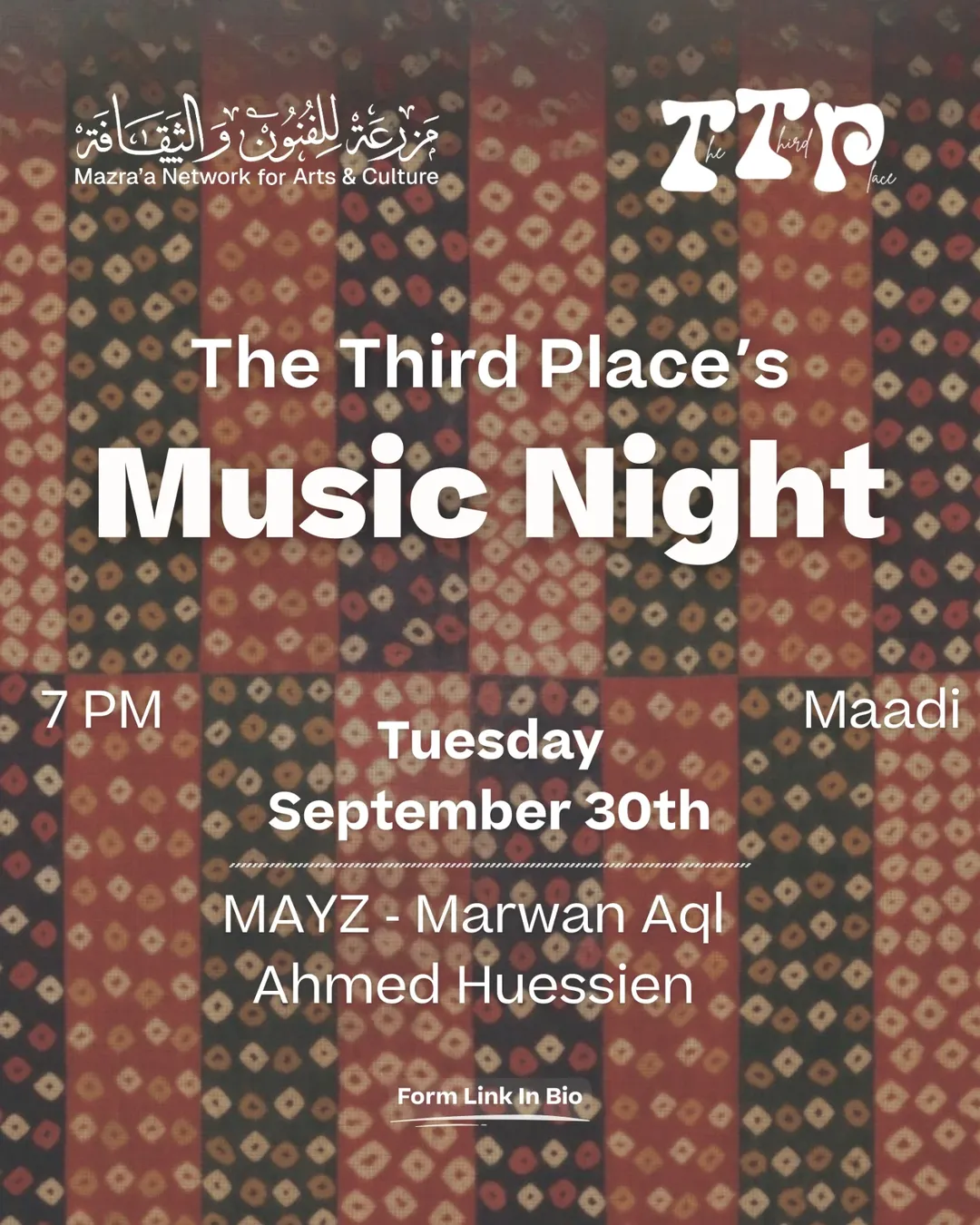 The Third Place By Mazra’a Network for Arts & Culture, MaadiJoin Music Night at The Third Place By Mazra’a Network for Arts & Culture on September 30. For more information, hit this link!